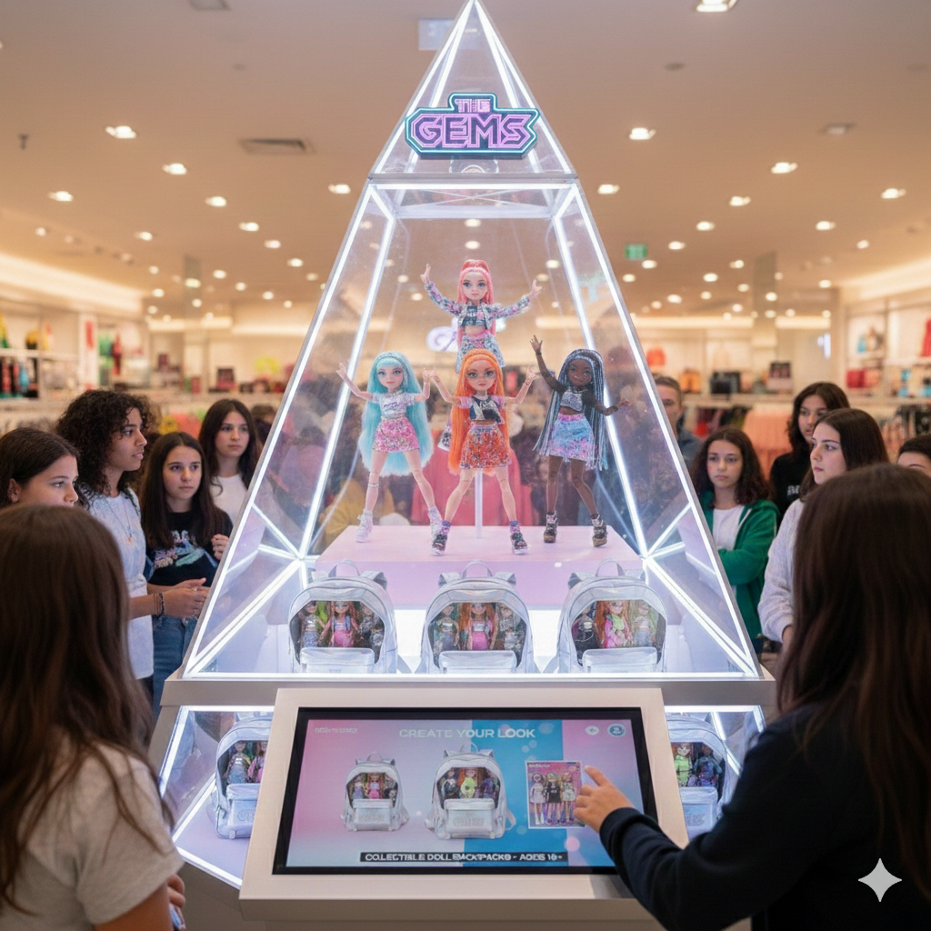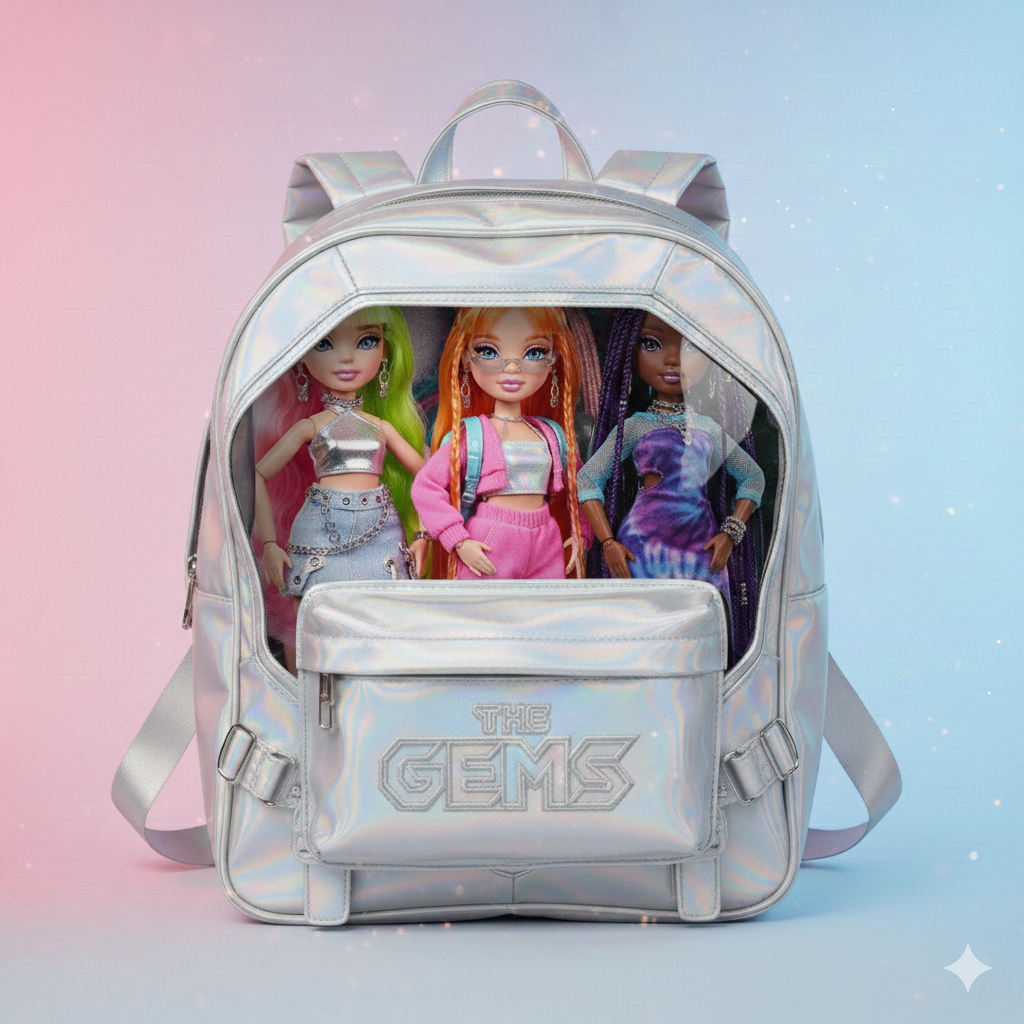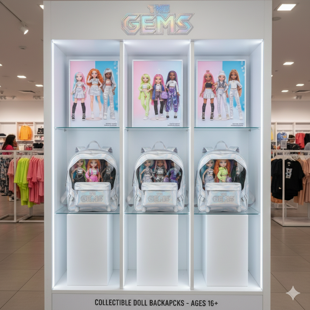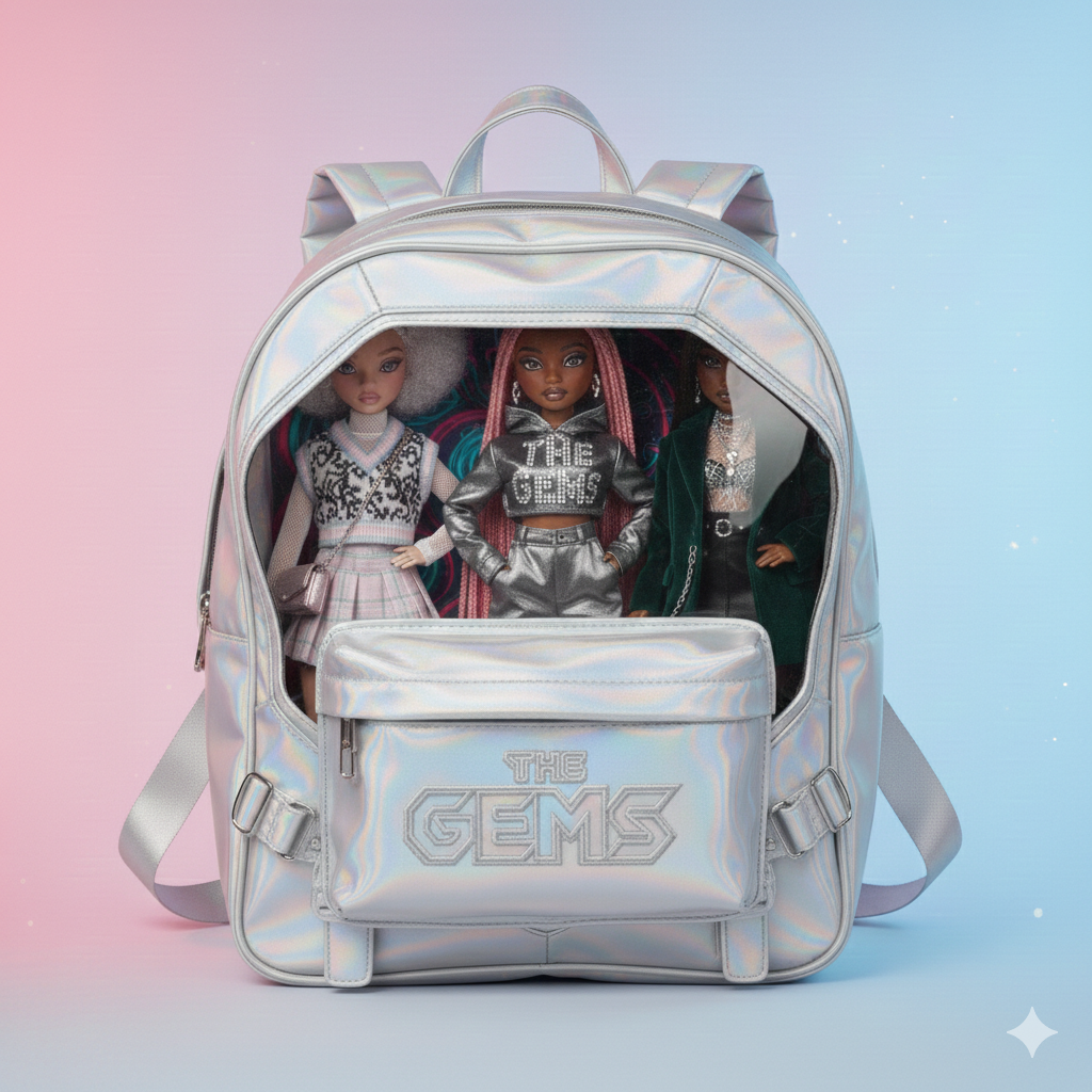 The unboxing experience is a silver futurist backpack bag, designed as a reusable, mini accessory that reinforces the collectible, fashion-forward identity of the dolls. Retail displays extend the narrative with cohesive color, typography, and dynamic presentation, creating an aspirational, high-fashion brand presence.